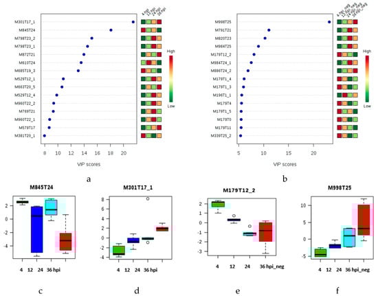VIP score-plots derived from the PLS-DA analysis, displaying the discriminant features at the early asymptomatic infection stage (cluster I: 4, 12, 24 and 36 hpi): (a) LC-ESI (+)-MS and (b) LC-ESI (−)-MS. Coding of M and T after the number respectively indicates nominal mass and retention time of each feature. (c–f). Box plots from s-plot of the molecular features M845T24 (m/z 845.4816), M301T17 (m/z 301.1379), M179T12 (m/z 178.9792) and M998T24 (m/z 997.5185), respectively. In the box plot, Y axis represents intensity of the metabolites as quartile for each sample group related to all data set. The range of the vertical scale is from the minimum to the maximum value of the selected group, or, to the highest or lowest of the displayed reference points, median, and 95% confidence interval of the mean. Coding 4-hpi means positive ionization mode analysis of the samples collected at four hours post infection. Coding 4-hpi_neg means negative ionization mode analysis of the samples collected at four hours post infection. Coding C and C_neg indicates the analysis of the controls in positive and negative ionization modes, respectively.