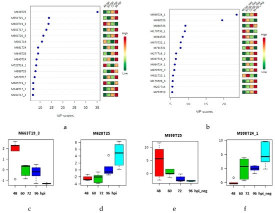 VIP score-plots derived from the PLS-DA analysis displaying discriminant features at the late infection stage (cluster II: 48, 60, 72 and 96 hpi): (a) LC-ESI (+)-MS and (b) LC-ESI (−)-MS. Coding of M and T after the number respectively indicates the nominal mass and retention time of each feature. (c–f). Box plots from s-plot of the molecular features M663T19 (m/z 663.4508), M628T25 (m/z 628.3657), M998T24 (m/z 997.5185) and M998T25 (m/z 997.5184), respectively. In the box plot, Y axis represents intensity of the metabolites as quartile for each sample group related to all data set. The range of the vertical scale is from the minimum to the maximum value of the selected group, or, to the highest or lowest of the displayed reference points, median, and 95% confidence interval of the mean. Coding 48-hpi means positive ionization mode analysis of the samples collected at forty-eight hours post infection. Coding 48-hpi_neg means negative ionization mode analysis of the samples collected at forty-eight hours post infection. Coding C and C_neg means the analysis of the controls in positive and negative ionization modes, respectively.