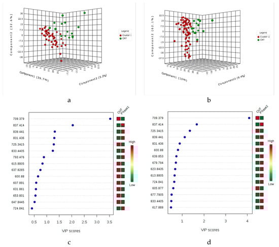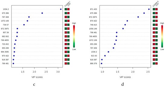 Multivariate partial least squares discriminant analysis applied to the MALDI (−)-MS data: (a) Early asymptomatic infection and control and (b) Late asymptomatic infection and control. VIP plots (c) Early asymptomatic infection and control and (d) Late asymptomatic infection and control.