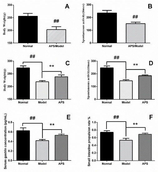Body weight and spontaneous activity of the control (normal) group and the Astragalus polysaccharide (APS)/model group (A), (B). The values given are the means ± SD (n = 7 in normal group, n = 14 in APS/model group). After APS intervention, the change of body weight, spontaneous activity, gastrin concentration, and small intestine propulsive rate in the normal group, model group, and APS group are shown in (C), (D), (E), (F). The values given are the means ± SD (n = 7); ## p < 0.01 compared with the normal group, ** p < 0.01 compared with the APS group.
