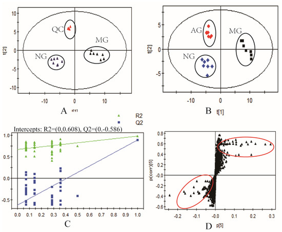 The mass spectrometry data of quality control (QC) samples acquired from LC-MS were pretreated with XCMS software, and the result of principal component analysis (PCA) score plot are shown in Figure 2A. All QC samples were clustered together and concentrated in the 95% confidence interval, suggesting the instrument was working properly, and the data quality was reliable. In order to search the differences and relationships among the three groups, multivariate statistical analysis methods were applied, including PCA and partial least-squares-discriminant analysis (PLS-DA). The results of PCA are shown in Figure 2A. Our results showed that the normal group and the model group were effectively separated, and the cohesion in the same group was fine. The results implied that the animal model was established successfully, and the serum metabolic patterns of the model group and the normal group were different. PLS-DA was applied to discover the contributable variable among the three groups (Figure 2B). In the PLS-DA model, cumulative R2Y and Q2 were 0.981 and 0.912, respectively. (R2Y is the fitting ability of the model, Q2 is the prediction ability of the model, high values of both mean a successful model), while the intercepts of R2 and Q2 were 0.608 and 0.586 (100 random arrangement tests, Figure 2C). These data suggested that the PLS-DA models were reliable and valid. An S-Plot was acquired to screen for biomarkers (Figure 2D). S-plots can reflect the covariance and correlation between a model and the variables. The farther away from the origin are the spots, the greater the classification ability, which may lead to the identification of potential biomarkers. S-plots can reduce the false positive rate in potential marker selection.