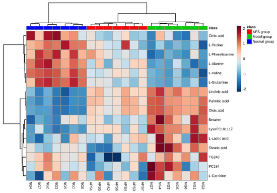 Heat map of the 16 differentially produced endogenous metabolites between the normal group, model group, and APS group. Orange plots indicate up-regulated metabolites, and blue plots indicate down-regulated metabolites in rats.