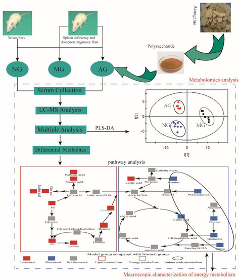 Astragalus polysaccharide (APS) is a homogeneous polysaccharide extracted from Radix Astragali (root of Radix Astragali (Fisch.) Bge. var. mongholicus (Bge.) Hsiao or Radix Astragali (Fisch.) Bge.). Several studies have indicated that APS has a wide range of therapeutic effects, including ameliorating chemotherapy-induced cardiotoxicity [8] and ionizing radiation-induced oxidative stress [9], regulating inflammatory reactions [10], treatment of diabetes [11], as well as antitumor activity and enhancement of the immune function [12]. DSD includes gastrointestinal dysfunction. It was reported that APS could significantly improve the colitis disease activity index (DAI) and histological scores, as well as increase weight and colon length in mice [1]. APS could also decrease the production of inflammatory factors such as TNF-α, IL-1β, IL-6, IL-17 [13,14] in a study in a mouse model of dextran sulfate sodium (DSS)-induced colitis. In addition, a study on an APS-based intervention for chronic atrophic (CAG) induced by N-methyl-N’-nitro-N-nitrosoguanidine (MNNG) in rats found that the gastric morphology improved, and plasma gastrin and somatostatin levels significantly increased [15]. These studies indicate that APS has a good effect on DSD. Yet, reports on the changes of the serum levels of small molecules in DSD-affected rats are rare. A recent study has demonstrated that dietary supplementation with APS enhanced ileal digestive and absorption function through regulating amino acids metabolism [16]. Although this study is focused on the regulatory effect of APS on amino acids, it also briefly presents the effects on other endogenous metabolites, which, nevertheless, was not conducive to explaining the mechanism of APS in the treatment of the DSD. In order to explore the mechanism of small molecule changes after APS treatment of DSD from the microscopic and holistic perspectives and to show the material and theoretical basis for clinical medication, we chose to perform serum metabolomics to determine the changes in small molecule metabolites from a holistic perspective. According to clinical studies, patients with digestive system dysfunction generally lose weight and reduce the level of independent activities. Therefore, body weight and spontaneous activity were recorded to verify if the model was valid and to explore the therapeutic effect of APS. In this study, metabolomics analysis was helpful to shed light on the mechanism of APS in treating DSD and to clarify the Chinese medicine ingredients effective in the treatment of diseases.