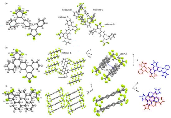 Molecular structures and packing modes of (a) 3, (b) 4a, and (c) 4b. One of the independent molecules (3: molecule A, 4a: molecule E) is shown for clarity. Two fluorine atoms (F9 and F10) bound to CF2 carbon (C27) in 4b and some fluorine atoms in two independent molecules (molecules C and D) of 3 are disordered (see Figures S13 and S15). For 4a, the face-to-face distance is calculated between the polyaromatic hydrocarbon (PAH) cores, which are optimized by the least square method. For 4b, its crystallographic data are not satisfied to discuss the bond lengths and short-contacts distances (see Section 3.5).