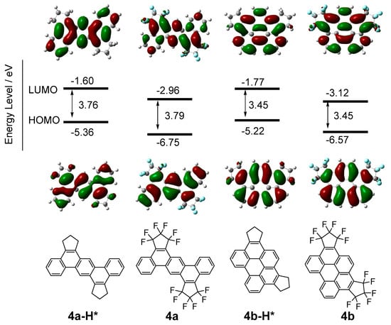 To evaluate effect of the introduction of PFCP units to the PAH backbone, a computational study was carried out by DFT at the B3LYP/6-311G(d) level, together with 4a-H* and 4b-H*, in which all the fluorine atoms of 4a and 4b are replaced with hydrogen atoms for comparison (Figure 3). As shown in this diagram, the LUMOs in 4a and 4b are extended to the PFCP units, and their LUMO levels (−2.96 eV for 4a and −3.12 eV for 4b) are remarkably lower than those of 4a-H* (−1.60 eV) and 4b-H* (−1.77 eV). The HOMO levels of 4a (−6.75 eV) and 4b (−6.57 eV) are also lower than those of 4a-H* (−5.36 eV) and 4b-H* (−5.22 eV), due to electro-negative fluorine groups in PFCP units. The HOMO–LUMO gap of benzoperylene-type 4b (3.45 eV) is smaller than that of dibenzoanthracene-type 4a (3.79 eV). This trend is consistent with the difference in the UV-Vis absorption peaks between 4a and 4b, as described above.