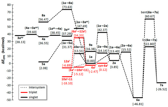 Although a formyl-phosphinidene was not located at the closed-shell PES of 1a, excitation of 1a to its first triplet state is accomplished with structural reorganization leading to the triplet formyl-phosphinidene 12at (Scheme 2, Figure 4), as previously recognized [8]. The same excitation in oxaphosphirane-3-ylidene 2a leads to syn-6at that isomerizes to the anti conformer 6at. The latter species can isomerize to the aforementioned species 12at or split into the “stable” species triplet phosphinidene (10at) and carbon monoxide (11).