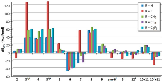 In case of the other differently substituted oxaphosphirenes 1a–e, the energies of the same set of isomers was computed. In almost all cases the most stable closed-shell species follow the same order as for the parent compounds, starting by the most stable phosphaketene (phosphaisocyanate) R–P=C=O: 6 > 7 > 1 > 5 ≥ 2 > 9 (Figure 5). On the contrary, in case of the fluoro-substituted species, 7b is strongly destabilized (also both conformers 3b as well as 5b to a lesser extent), whereas 2b and 9b (also 10b) are comparatively stabilized. This results in a different order of stability 6b > 2b > 9b > 1b > 5b > 7b (Figure 4). Triplet electronic states display similar stability than (singlet) oxaphosphirenes 1, with two general exceptions: 1) splitting into triplet phosphinidene (10t) and carbon monoxide (11) are usually favored and 2) the fluorinated substituent comparatively favors all triplet state species (syn-6bt, 6bt and 12bt), especially the pair 10bt + 11 (obtained after dissociation). Compound syn-6et is not stable and spontaneously splits into 10et + 11.