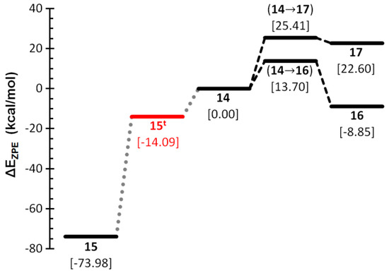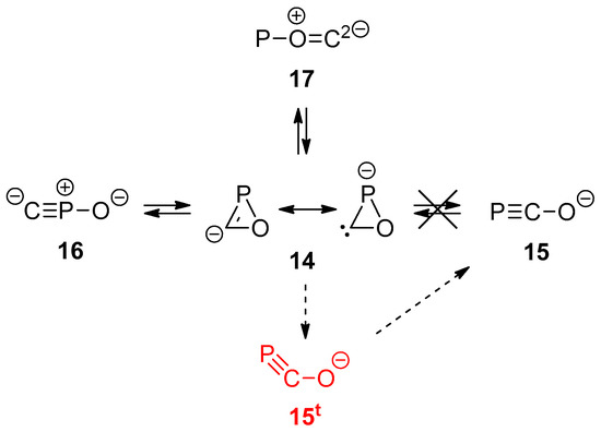 Formal substitution of H in the parent compounds by a lone pair affords the set of anionic species of general formula CPO−, for which only four closed-shell minima were found: the oxaphosphirenide 14 and the products resulting from endocyclic P–O (15), C–O (16), and P–C (17) bond cleavage (Scheme 4). For only the two latter ring cleavage processes, the corresponding TSs were characterized. With a small barrier, the C–O bond cleavage of 14 affords exergonically CPO− 16, whereas cleavage of the P–C bond occurs through a moderately higher barrier and giving rise to the less stable isomer POC− 17 (Figure 6). On the contrary, cleavage of the P–O bond under the restricted (closed-shell) formalism leads to splitting into CO and a P- anion, but excitation of 14 to the first triplet electronic state leads to a spontaneously cleavage of the P–O bond, affording the bent triplet species 15t which, on falling to the electronic ground (singlet) state, enables the access to the most stable isomer, the linear phosphaethynolate anion PCO− 15.