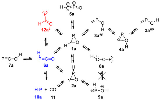 Isomers derived from parent oxaphosphirene 1a. Singlet (closed-shell) structures represented in black, triplet ones in red, and those that were found in both electronic states are in blue.
