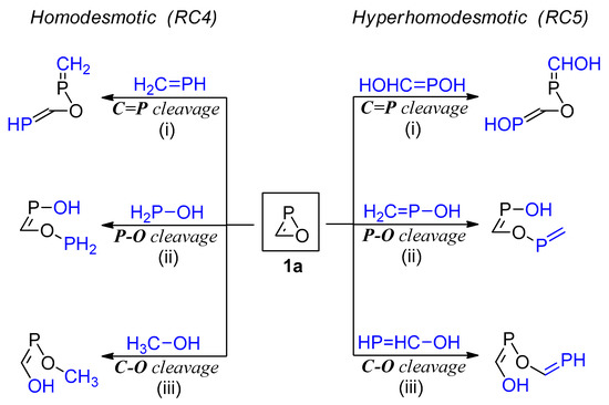 Ring strain is one of the most characteristic features in small rings, providing the driving force for their transformations into open-chain (or ring-enlarged) products [50]. The ring strain energy (RSE) for the parent saturated oxaphosphirane ring was reported to be 23.5 kcal/mol (computed at the CCSD(T)/def2-TZVPP level) [51]. As double bonds normally entail enlarged bond angles, their incorporation into small cyclic systems should be expected to result in an increase in the RSE, as occurs, for instance, in moving from cyclopropane to cyclopropene (RSE = 29.0 and 54.5 kcal/mol, respectively [52]). In the case of the parent oxaphosphirene ring system 1a, the RSE was computed by evaluating the energetics of appropriate homodesmotic reactions (Scheme 5), similar to those used for other three- [46,48,51,53,54,55,56,57] or four-membered [47] saturated phosphorus heterocycles. In such reactions, for the cleavage of every endocyclic X–Y (or X=Y) bond, a HnX–YHm (or HnX=YHm) reagent is used, the valences of X and Y being completed with H atoms. In reactants and products, the number of every type of bonds (single/double) between X and Y, with the same hybridization states in X and Y, must be conserved, as well as the number of sp3, sp2, and sp-hybridized (and non-hybridized, in case) atoms of every element with 0, 1, 2, or 3 H atoms attached. By averaging the opposites of the zero point-corrected energies for the three homodesmotic endocyclic bond cleavage reactions of 1a, a rather high value of RSE (Table 2) was obtained (see Computational Details).