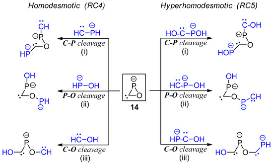 Homodesmotic and hyperhomodesmotic reactions used for the evaluation of the RSE in oxaphosphirenide anion 14.