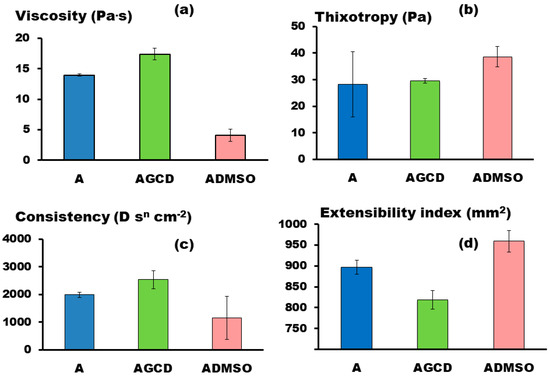 Mean results ± 95% confidence intervals corresponding to the rheological behavor of the three semisolid AmB tested formulations: (a) mean viscosity (Pa·s) at 15 rpm (significant differences, p < 0.01); (b) thixotropy (Pa) (no significant differences, p > 0.1); (c) consistency (D sn cm−2) (significant differences, p < 0.01); (d) extensibility index (mm2) (significant differences, p < 0.05). Key: (A) semisolid AmB simple reference formulation, (ADMSO) is an AmB reference formulation with DMSO and (AGCD) is an AmB formulation with γ-cyclodextrins. Statistics was performed with an analysis of variance (ANOVA) test (n = 3 samples for each formulation).