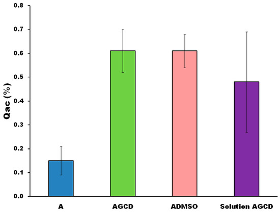 Average results ± 95% confidence intervals of AmB accumulation at the skin (Qac) obtained with three semisolid tested formulations and a liquid solution of AmB dissolved with cyclodextrins. Key: (A) semisolid AmB simple reference formulation, (ADMSO) is a semisolid AmB reference formulation with DMSO, (AGCD) is a semisolid AmB formulation with γ-cyclodextrins. A liquid solution of AmB solubilized with γ-cyclodextrin is also tested as reference. Statistics data treatment was performed with an ANOVA test (n = 9 for each formulations). The AmB skin accumulation obtained with formulation A was significantly (p < 0.01) lower than the skin accumulations obtained with the others formulations.