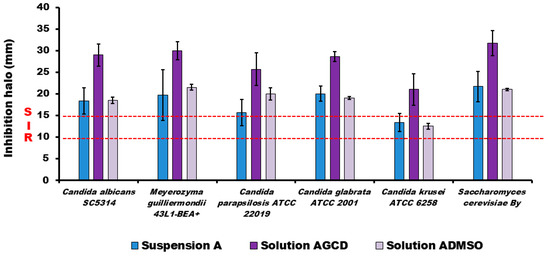 Antifungal in vitro activity of three liquid AmB formulations against different species of Candida and Saccharomyces cerevisiae (Saccharomyces cerevisiae By). Disks were embedded with 20 µL of AmB reference suspension (Suspension A), an AmB solution with cyclodextrins (Solution AGCD), or an AmB solution with DMSO. The growth inhibition halo diameters were measured at points where there was a complete inhibition of yeast growth. The isolates were classified as susceptible (S) to AmB when the inhibition zone was ≥15 mm, resistant (R) when it was ≤10 mm, and intermediate (I) or susceptible-dose dependent when the inhibition zone was between 10–14 mm [19]. Growth inhibition halo diameters are expressed as mean ± standard deviation (SD) are in mm. Each experiment was performed in triplicate. No antifungal activity, measured as halo inhibition (<1 mm), was observed with Orabase®, DMSO, and γ-cyclodextrins products.