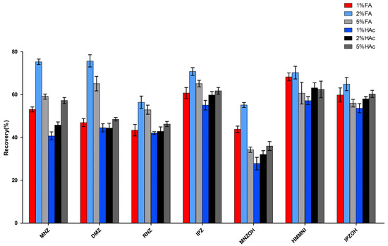 We have demonstrated the applicability of Oasis MCX cartridge which combines strong cation exchange and C18 reversed phase interactions in the cleanup and enrichment of nitroimidazoles in swine liver and kidney [17,21]. When testing honey samples in the preliminary experiments, the Oasis MCX cartridge also provided high recovery and clear final extracts, but cartridge clogging which affected the recovery, often occurred with different kinds of honey and was likely due to the complexity of the honey matrix. To address this problem, we tried to apply d-SPE using MCX sorbent which could omit sample loading compared to conventional SPE steps. The dissolving solution of honey sample is critical for the following d-SPE procedure. Since an acidic solution is required for ion exchange adsorption on the MCX sorbent, formic acid (FA) (1%, 2%, 5%) and acetic acid (HAc) (1%, 2%, 5%) solutions were tested for honey dissolution and analytes locking onto the MCX sorbent. As depicted in Figure 1, 2% FA solution yielded the best recoveries for all of target compounds calculated without internal standards. The amounts of MCX sorbent (0.1, 0.2, 0.5 and 1 g) needed for 1 g of honey sample were also evaluated. The results indicated that at least 0.5 g of MCX sorbent should be used to obtain satisfactory recoveries.