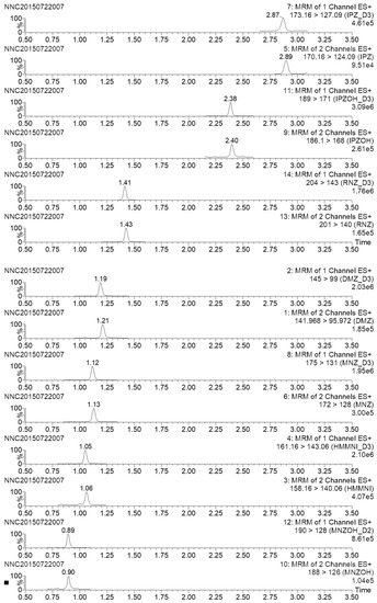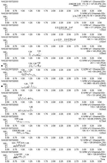 The analytical standards DMZ, RNZ, MNZOH, HMMNI, DMZ-d3, RNZ-d3, MNZOH-d2, and HMMNI-d3 were obtained from WITEGA (Berlin, Germany). MNZ, IPZ, IPZOH, IPZ-d3, IPZOH-d3, and MNZ-d3 were provided by the EU Reference Laboratory for Residues of Veterinary Drugs (BVL, Berlin, Germany). HPLC grade methanol, acetonitrile, FA, and HAc were purchased from Fisher Scientific Inc. (Pittsburgh, PA, USA). Ammonium hydroxide was provided by Beijing Chemical Co. (Beijing, China). Water was purified using a Milli-Q Synthesis system from Millipore (Bedford, MA, USA). MCX sorbent was purchased from DURLab (Beijing, China). Syringe filters (GHP ACRODISC, 0.2 µm) were purchased from Pall Corporation (Ann Arbor, MI, USA).