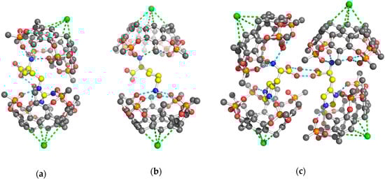 The analysis of the diffraction patterns revealed that the single crystals obtained by co-crystallization of the cavitand in the presence of the fully protonated amino acids were monoclinic (P21 space group) for the Arg and His complexes, while the Tiiii/Lys complex crystallized in the orthorhombic P21212 space group. The asymmetric unit of the 2 Tiiii[H, CH3, CH3]•Arg·2HCl and 2 Tiiii[H, CH3, CH3]•Lys·2HCl crystal structures is composed of two host and one guest molecule, forming a 2:1 host-guest ditopic complex (Figure 1a,b), while, in the 2 Tiiii[H, CH3, CH3]•His·2HCl crystal structure, four crystallographically independent cavitands and two amino acids molecules form a sort of dimeric 2:1 host-guest ditopic complex (Figure 1c).