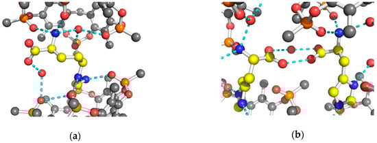 The ammonium group of Lys, located above the P=O plane, interacts and forms strong H-bonds with two adjacent P=O groups of Tiiii (Table 1 and Figure 3a,b) and with a water molecule inserted in the Tiiii cavity. This internal water molecule forms two H-bonds with the remaining oxygen atoms of the P=O groups (Table 1 and Figure 3a,b).