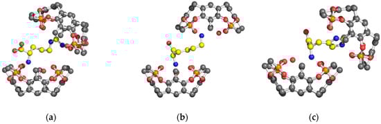 The guanidinium group of Arg was found to be statistically disordered over two equally populated positions (conformation I and II). In conformation I, the side chain of Arg interacts with all four P=O groups of Tiiii (Table 1 and Figure 2a,b), and its terminal atoms are inserted below the main plane, defined by the oxygen atoms of the P=O groups. The planar guanidinium group forms a dihedral angle of 40° with the mean plane of the four oxygen atoms of the P=O groups of Tiiii host. In conformation II, the planar guanidinium group is more perpendicular with respect to the oxygen atoms’ plane (dihedral angle of 63°), and forms only two strong H-bonds with two opposite P=O groups (Table 1 and Figure 2c,d). In this case, a NH2 group is located in the center of the cavity of the tetraphosphonate host, and it is slightly more deeply inserted in the cavity with respect to the other conformation (Table 1 and Figure 2b,d).