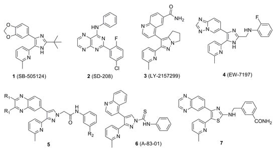 For this reason, many small molecule ALK5 inhibitors, such as compounds 1 (SB-505124) [10], 2 (SD-208) [11], 3 (LY-2157299) [12], and 4 (EW-7197) [13] were synthesized at major research institutions (Figure 1). These compounds inhibited ALK5 autophosphorylation and TGF-β-induced transcription of extracellular matrix genes at sub-micromolar concentrations in reporter assays, as shown in Figure 1. Among them, clinical candidates, compounds 3 and 4 have progressed to Phase II and Phase I trials as antitumor agents, respectively.