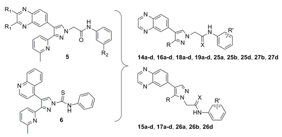 Previously, we showed that the methyl group of 6-methylpyridine in compound 4 formed hydrophobic interactions with the aromatic ring of Tyr249 and the nitrogen atom of the same moiety formed a water-mediated hydrogen bonding network with the side chains of Tyr249 and Glu245 and the backbone of Asp351 [13]. In previous studies, we found that the introduction of electron-donating groups into quinoxaline or quinoline rings failed to increase ALK5 inhibition activity [14]. This is due to the steric hindrance of their rigid structures. Therefore, we assumed that the ALK5 inhibition activity will be enhanced by introducing the electron-donating groups or the structure with many binding sites into the non-rigid pyridine ring on the premise of maintaining the non-substituent quinoxaline structure. To examine whether the capability of the nitrogen atom of the 6-methylpyridine moiety as an H-bond acceptor would be increased by other substitutions, we introduced 6-(dimethylamino)pyridin-2-yl, 4-methylthiazol-2-yl [17,18,19], and pyrimidin-4-yl groups [20], instead of the 6-methylpyridine moiety in 5 series compound. Based on this finding and previous research, we tried to replace the thioamide linkage with a chemically stable thioamidomethylene linkage and, designed compounds 18a–d, 19a–d, 27b, and 27d (Figure 2). To compare the effects of the thioamidomethylene linkage in 18a–d, 19a–d, 27b, and 27d on ALK5 inhibitory activity, their counterpart derivatives 14a–d, 15a–d, 16a–d, 17a–d, 25a, 25b, 25d, 26a, 26b, and 26d possessing an amidomethylene linkage, were also designed. The target compounds 14b–d, 16b–d, 15b–d, 17b–d, 18b–d, 19b–d, 25b, 25b, 25d, 26b, 26b, 26d, 27b, and 27d each possess a substituent, either o-F, m-F or m-CN, in the phenyl ring because these were previously found to be most beneficial for ALK5 inhibitory activity and selectivity [13].