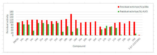 Residual ALK5 and p38α MAP kinase activities in the presence of 3-substituted-4-(quinoxalin-6-yl) pyrazoles 14a–d, 15a–d, 16a–d, 17a–d, 18a–d, and 19a–d.