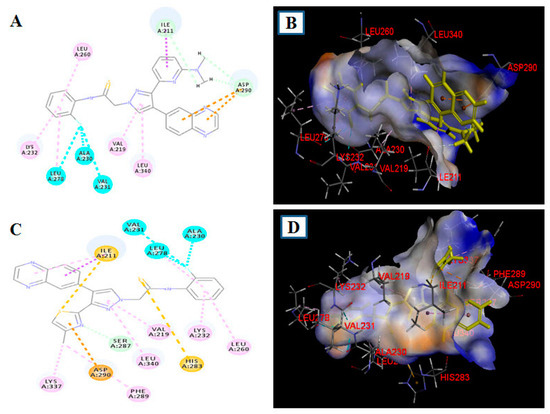 Docking pose of compounds 18b and 19b in the active site of ALK5 (PDB: 1RW8). (A) 2D binding model of 18b; (B) Proposed pose of 18b in the binding pocket of ALK5; (C) 2D binding model of 19b; (D) Proposed pose of 19b in the binding pocket of ALK5. The ligands are shown in yellow.