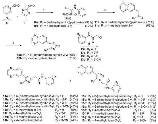3.1.4. General Procedure for the Preparation of 2-(3-(6-(Dimethylamino)pyridin-2-yl)-, 2-(3-(4-Methylthiazol-2-yl)- or 2-(3-(Pyrimidin-4-yl)-4-(quinoxalin-6-yl)-1H-pyrazol-1-yl)acetamide (14a–d, 16a–d, 25a, 25b, 25d) and 2-(5-(6-(Dimethylamino)pyridin-2-yl)-, 2-(5-(4-Methylthiazol-2-yl)- or 2-(5-(Pyrimidin-4-yl)-4-(quinoxalin-6-yl)-1H-pyrazol-1-yl)-N-phenylacetamide (15a–d, 17a–d, 26a, 26b, 26d)