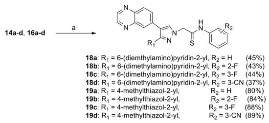 3.1.5. General Procedure for the Preparation of 2-(3-(6-(Dimethylamino)pyridin-2-yl)-4-(quinoxalin-6-yl)-1H-pyrazol-1-yl)-N-phenylethanethioamide 18a–d, 2-(3-(4-Methylthiazol-2-yl)-4-(quinoxalin-6-yl)-1H-pyrazol-1-yl)-N-phenylethanethioamide 19a–d or N-Phenyl-2-(3-(pyrimidin-4-yl)-4-(quinoxalin-6-yl)-1H-pyrazol-1-yl)ethanethioamide (27b and 27d)