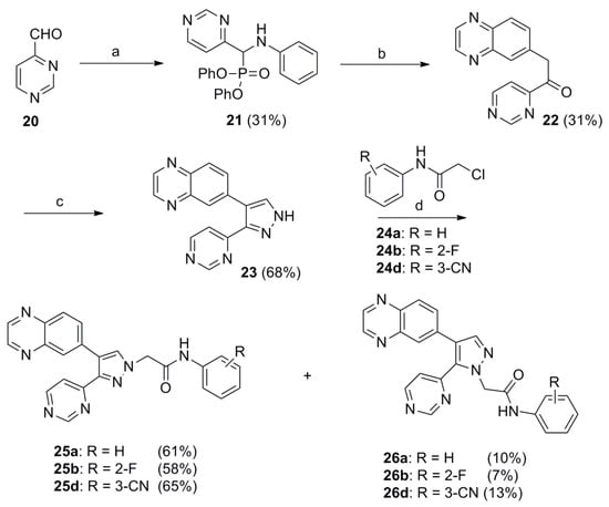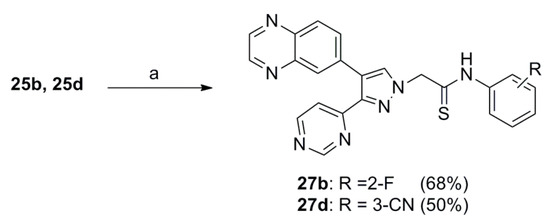 To increase binding sites with key proteins, the 3-(pyrimidin-4-yl)-4-(quinoxalin-6-yl)pyrazoles 25a, 25b, and 25d were synthesized as shown in Scheme 3. Pyrimidine-4-carbaldehyde (20) [26] was synthesized from commercially available 1,1-dimethoxyacetone and N,N-dimethylformamide dimethyl acetal via 3 steps. Compound 23 was synthesized from compound 20 via 3 steps in the same reaction condition as described in Scheme 1. The pyrazole 23 was further alkylated with substituted phenylacetamides 24a, 24b, or 24d in the presence of NaH in anhydrous DMF to yield the target compounds 25a, 25b, 25d and their positional isomers 26a, 26b, 26d in 58–65% and 7–13% yields, respectively. These positional isomers were also separated by column chromatography and their structures were confirmed by NOE experiments (Scheme 3). Similarly, the thioamide compounds 27b and 27d were synthesized from 25b and 25d in the same reaction condition as described in Scheme 2 (Scheme 4). As expected, all synthesized target compounds were quite stable during long-term storage at room temperature.