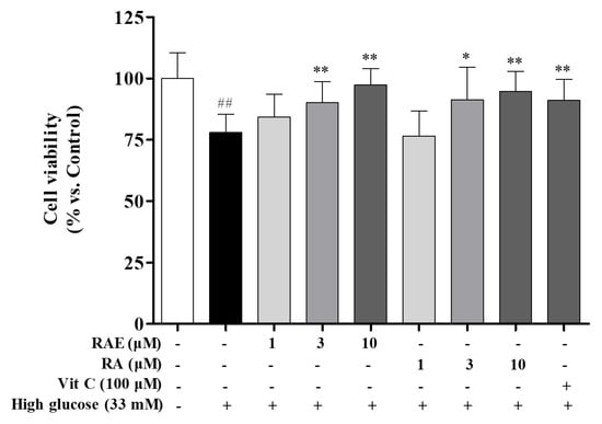 2.1. Effect of RAE on Cell Viability Induced by High Glucose