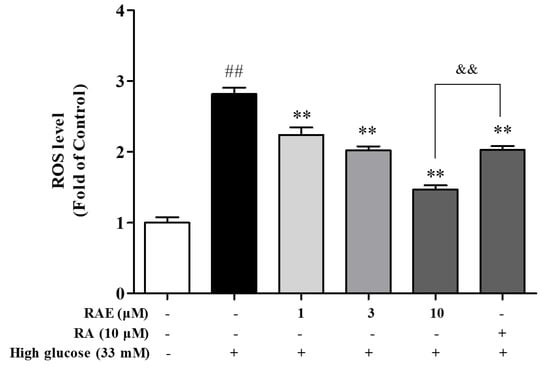 Effect of RAE on ROS generation in high glucose-induced human endothelial cells. EA.hy926 cells were co-treated with 33 mM of glucose and RAE or RA at different concentrations for 48 h. Intracellular ROS production was assessed by fluorescence of 2′,7′-dichlorofluorescin diacetate (DCFH-DA), as described in methods. Results were expressed as mean ± SD (n = 3). ## P < 0.01, vs. control; ** P < 0.01, * P < 0.05, vs. high glucose; && P < 0.01, vs. RAE group.