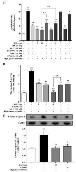 Caspase-3 is essential in regulating cell apoptosis as the executive protein. The incubation of high glucose caused a 3.4-fold excessive increase in caspase-3 activity (Figure 3D) in endothelial cells. Compared with the model group, treatment of RAE (1, 3, and 10 μM) and RA (10 μM) led to a significant decrease in caspase-3 activity, and the inhibition rates were 57.5%, 63.4%, 96.2%, and 65.0%, respectively. The results indicated that RAE exerted an anti-apoptotic role in EA.hy926 cells induced by high glucose.