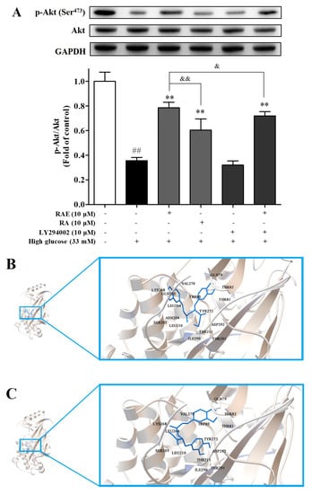 (A) Effect of RAE on Akt phosphorylation in endothelial cells treated with high glucose. EA.hy926 cells were treated with RAE or RA in the medium containing 33 mM of glucose for 48 h. Cells were exposed to LY294002 for 30 minutes before incubation with high glucose and RAE. Then, the cell lysates were collected. The phosphorylation of Akt was detected by Western blot using a phosphor-specific Akt antibody, normalized to total Akt. The results were expressed as mean ± SD (n = 5), and one representative image of five individual experiments is shown. ## P < 0.01, vs. control; * P < 0.05, ** P < 0.01, vs. high glucose; & P < 0.05, && P < 0.01, vs. RAE (10 μM) group. (B) Docked pose of RAE in the active site of Akt. (C) Docked pose of RA in the active site of Akt. (D) Docking interactions of RAE with proper residues in the active site of Akt. (E) Docking interactions of RA with proper residues in the active site of Akt.