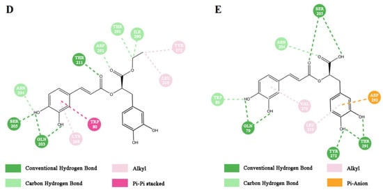 Furthermore, a molecular docking study was performed to analyze the interactions of RA and RAE in the active site of Akt. Homo sapiens Akt (PDB code: 4EJN) was chosen for docking studies according to report before [24]. The docked poses and docking interactions of RAE and RA in the active site of Akt are depicted in Figure 4B–E. According to the docking results, the carboxyl moiety of RA presented conventional hydrogen bonding with Ser205, and the ethyl moiety of RAE was detected as binding to Thr291 and Ile290 residues through a carbon hydrogen bond and binding to Tyr292 and Leu210 through an alkyl–alkyl bond in the active site of Akt. Overall, these possible interactions formed the basis of the potent promoting activity of RAE to Akt.