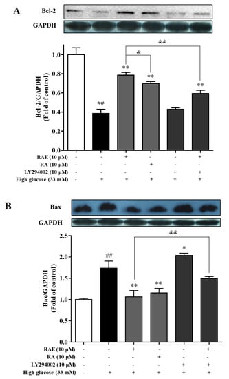 Effect of RAE on the expression of Bcl-2 and Bax in human endothelial cells treated with high glucose. EA.hy926 cells were treated with or without RAE (10 μM) or RA (10 μM) in the medium containing 33 mM of glucose for 48 h. Cells were exposed to LY294002 (10 μM) for 30 min before incubation with high glucose and RAE. The Bcl-2 (A) and Bax (B) expression were analyzed by Western blot with related antibodies. GAPDH was used as an internal control. The quantitative results were expressed as the mean ± SD (n = 3), and one representative image of three individual experiments is shown. # P < 0.05, ## P < 0.01, vs. control; * P < 0.05, ** P < 0.01, vs. high glucose; & P < 0.05, && P < 0.01, vs. RAE (10 μM) group.