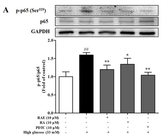 We also examined the level of p-p65 and p-JNK to detect whether the NF-κB and JNK pathways were involved in the anti-apoptosis effect of RAE. As illustrated in Figure 3C, the apoptosis rate of treatment with PDTC (NF-κB inhibitor) (10 μM) significantly decreased, and the inhibition rate was 80.2%. Furthermore, as shown in Figure 6A, the level of p-p65 was significantly increased when incubated with high glucose for 48 h. Compared with the model group, the treatment of PDTC inhibited the phosphorylation of NF-κB-p65, and the inhibition rate was 86.7%. Treatment of RAE or RA also inhibited the activation of p65, and the inhibition rates were 71.1% and 48.9%, respectively.