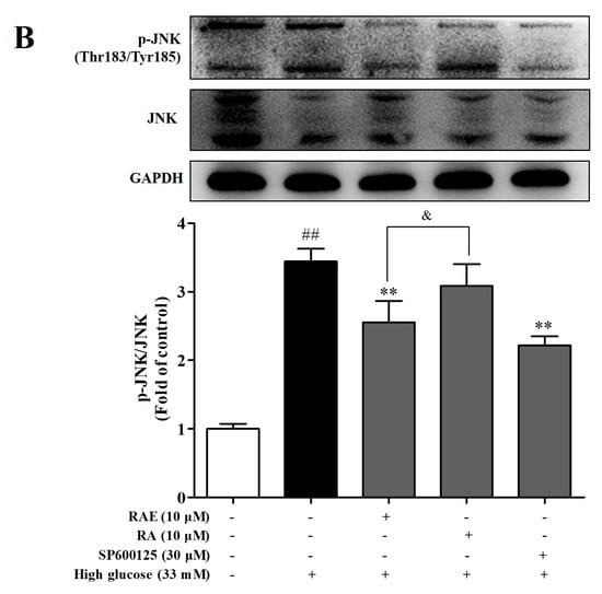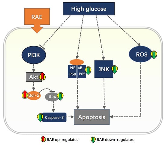 Importantly, these mechanisms may be interrelated. For example, hyperglycemia-induced oxidative stress promotes both NF-κB and JNK activation, and depresses PI3K activation [44,45,46]. NF-κB may also cross-talk with the JNK signaling pathway in high glucose-induced endothelial cell apoptosis [9]. In our present experiments, we did not verify the interactions among these pathways, which will be the next research task: to clarify the mechanisms and the potential target of RAE.