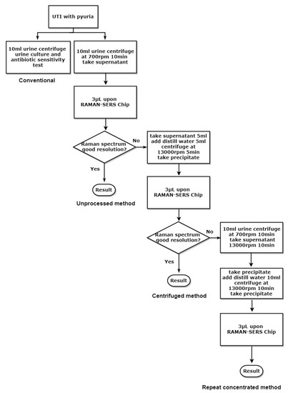 A urine sample of 10 mL was centrifuged at 700 rpm for 10 min. The supernatant was aspirated to separate it from the precipitate containing white blood cells (WBCs), immune cells, and cell debris. The unprocessed supernatant was loaded on a cylindrical Raman SERS chip (Labguide Co., Ltd. Taipei, Taiwan) (Figure 1, unprocessed method). For those unprocessed supernatants with a poor Raman spectrum resolution, we concentrated the supernatant (5 mL) by mixing it with an equal amount of distilled water and centrifuged the mixture at 13,000 rpm for 5 min; the supernatant after the high-speed centrifugation was discarded. The concentrated precipitate (3 μL) was loaded upon SERS chip for bacterial detection (Figure 1, centrifuged method). If the Raman spectrum resolution was still too low to identify a bacterial pathogen after first centrifugation, a 10 mL urine sample was treated with 700 rpm for 10 min, followed by twice centrifuging the supernatant at 13,000 for 10 min to further concentrate the urine sample. The final precipitate (3 μL) was then loaded on a Raman chip (Figure 1, repeat concentrated method).