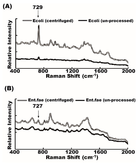 Raman shift patterns of bacteria from the unprocessed and centrifuged Raman. Raman spectrum of urine bacteria from the unprocessed sample (black line) and centrifuged sample (empty line) are similar. (A) Escherichia coli; (B) Enterococcus faecalis.