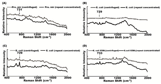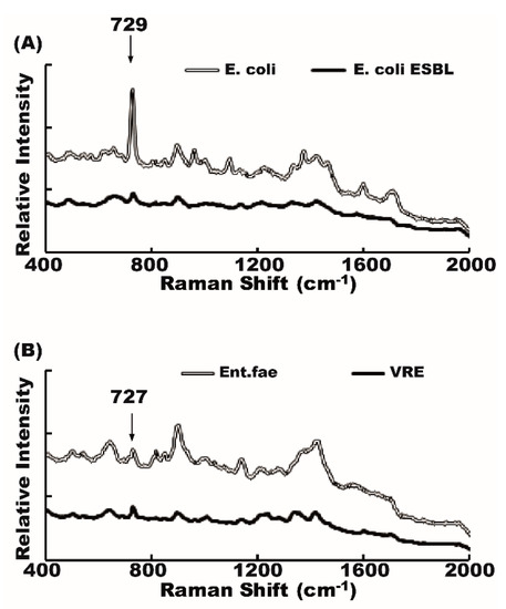 We then conducted a spectral analysis of antibiotic-susceptible bacteria and their antibiotic-resistant counterparts. The spectra were very similar in antibiotic-susceptible and antibiotic-resistant bacteria. Some bacterial signal, a 729 cm−1 peak, for example, could be seen in both antibiotic-susceptible E. coli and antibiotic-resistant E. coli ESBL (Figure 4A). Similarly, 727 cm−1 peaks could be seen in vancomycin-sensitive Enterococcus faecalis and its vancomycin-resistant counterpart (VRE) (Figure 4B). It is not easy to differentiate the antibiotic-susceptible from the antibiotic-resistant strain by only using the Raman shift spectrum.