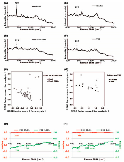 Principal component analysis (PCA) and the differentiation of antibiotic-susceptible and antibiotic-resistant bacteria. (A) Raman spectrum of E. coli; (B) Raman spectrum of E. coli ESBL; (C) PCA plots showed clustering of E. coli in the upper-left portion of the plot, and E. coli ESBL in the lower- right corner of the plot; (D) PC1 and PC2 loading plots corresponding to the PCA of (C); (E) Raman spectrum of E. faecalis; (F) Raman spectrum of VRE; (G) PCA plots show E. faecalis in the left side and VRE in the right side of the plot; (H) PC1 and PC2 loading plots corresponding to the PCA analysis of (G).