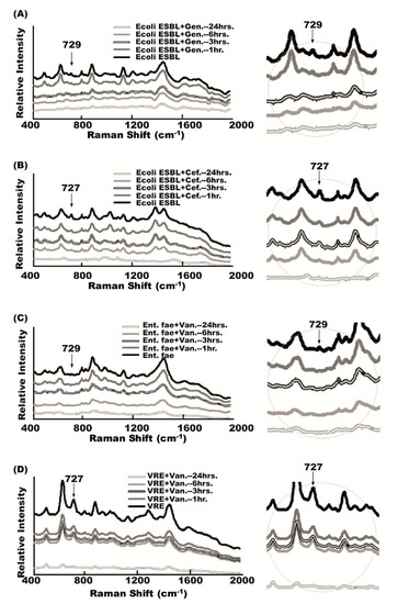 Antibiotic effects on bacterial-specific Raman signal. (A) 729 cm−1 signal peak of Raman spectrum time-dependently disappeared after gentamicin (Gen.) treatment in gentamicin-susceptible E. coli ESBL (gentamicin concentration: 0.256 mg/L); (B) E. coli-specific 729 cm−1 signal persisted in cefazolin (Cef.)-resistant E. coli ESBL. (cefazolin concentration: 0.256 mg/L); (C) Enterococcus-specific 727 cm−1 signal gradually disappeared after vancomycin treatment in vancomycin-susceptible Enterococcus faecalis (vancomycin concentration: 32.1 mg/L); (D) Enterococcus-specific 727 cm−1 signal persisted in VRE (vancomycin concentration: 0.256 mg/L).