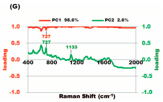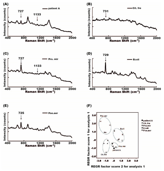 To solve the problem of mixed-flora infections, we used the PCA approach to perform the diagnosis. Among these mixed infections, infection causes could not be identified in seven cases. The Raman spectrum of mixed-flora infections resulted from a combination of the signal from different single flora. Some, but not all, bacteria-specific signals may be detectable. Citrobacter-specific signals (731 cm−1) and Proteus-specific signals (727 and 1133 cm−1) can be seen in samples with isolated bacterium infections, respectively (Figure 7B,C). However, not all bacterial signals could be identified in the Raman spectrum from specimens infected with Proteus and Citrobacter. It was difficult to identify a pathogen with the assistance of the software (Figure 7A). Therefore, we retrospectively used four kinds of known bacteria (E. coli, Pseudomonas, Proteus, and Citrobacter) and made a reference PCA plot. The four bacteria were located in different corners of the PCA plot. The location of patients infected with both Proteus and Citrobacter in the PCA plot was near the location of Proteus and Citrobacter, rather than near the location of E. coli or Pseudomonas (Figure 7F). The same tendency for the location of mixed infections can be seen in all seven cases (Supplementary Figure S1).