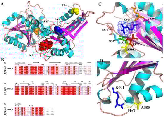 Position of site 380 in the model. (A) The novel monomeric model of AK and the docking position of Asp, ATP, Lys and Thr. (B) Homologous alignment generated by MEGA6 and modified by ESPript. (C) The residue around the binding site of the inhibitor Lys (at site 601 and shown in blue mesh). (D) Site 380 with the inhibitor. Blue: inhibitor lysine Yellow: site 380. Site 380 is connected to the inhibitor Lys by a water bridge.