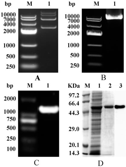Mutant strains, after successful sequencing, were cultured to an OD600 value of 0.6–0.8, after which isopropyl-β-d-thiogalactoside (IPTG) was added at a final concentration of 1 mM to induce growth overnight at 23 °C. The cells were subsequently collected by centrifugation at 4 °C, 8000 rpm for 10 min, and suspended in 10 mL PBS (pH 7.4). A crude enzyme solution, acquired from the supernatant of the second centrifugation (4 °C, 8000 rpm, 10 min), was purified by an Ni-NTA column. The purified solution was verified by SDS-PAGE (12% separation gel and 5% concentration glue) and Western blotting.