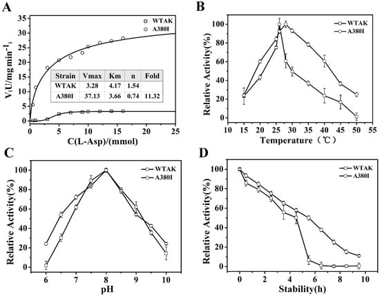 As shown in Figure 3B, the optimal temperature of WT-AK increased after mutation (A380I) with values of 26 °C and 28 °C, respectively. The enzyme activity of the mutant was seen to be higher than that of WT-AK when the temperature was either lower than 25 °C or higher than 28 °C, indicating that tolerance temperature had increased in the mutant. The optimal pH of both WT-AK and A380I was 8.0 (Figure 3C). However, when the pH was lower than 7.0, the activity of A380I was higher than that of WT-AK, indicating enhanced acid resistance, which would be conducive for subsequent fermentation [21]. The half-life of AK was extended from 4.5 h to 6 h after mutation, indicating enhanced enzyme stability by mutation (Figure 3D).