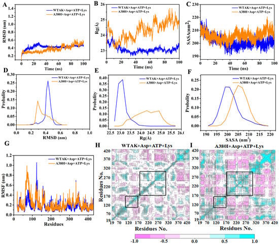 (A) RMSD plot during 100 ns MD simulations. Blue represents WT-AK + Asp + ATP + Lys and orange represents A380I + Asp + ATP + Lys, the same below. (B) Rg plot. (C) SASA plot. (D) The probability of RMSD of two complexes (WT-AK + Asp + ATP + Lys and A380I + Asp + ATP + Lys). (E) The probability of Rg. (F) The probability of SASA. (G) RMSF plot. (H) Domain cross correlation analysis performed on all Cα atom pairs of WT-AK with Asp, ATP and Lys. (I) Domain cross correlation analysis performed on all Cα atom pairs of A380I with Asp, ATP and Lys. The positive correlation region marked in the cyan indicated the strong correlated movement of the residue. The negative correlation region marked in the pink indicated anti-correlation movement of the residue. The diagonal was related to the relative height, representing the variance of the residue with itself.
