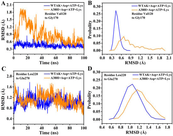 RMSD analysis of two complexes. (A) RMSD from residues Val120–Gly170. (B) The probability of RMSD from residues Val120–Gly170. (C) RMSD from residues Leu220–Glu270. (D) The probability of RMSD from residues Leu220–Glu270.