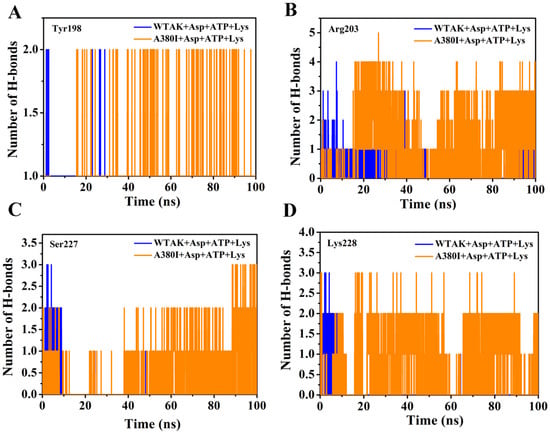 Number of H-bonds between different sites and the ATP of two complex systems (WT-AK + Asp + ATP + Lys and A380I + Asp + ATP + Lys) in 100 ns dynamic simulation. (A) Tyr198. (B) Arg203. (C) Ser227. (D) Lys228. WT-AK + Asp + ATP + Lys complex systems show in blue. A380I + Asp + ATP + Lys complex systems show in orange.